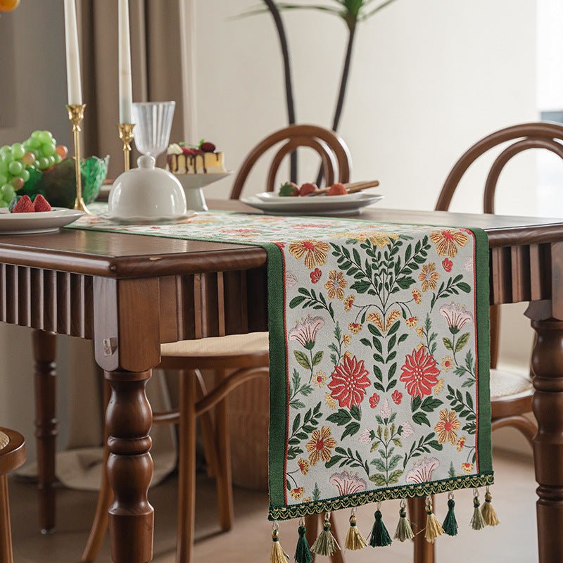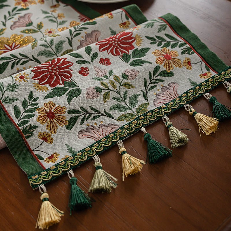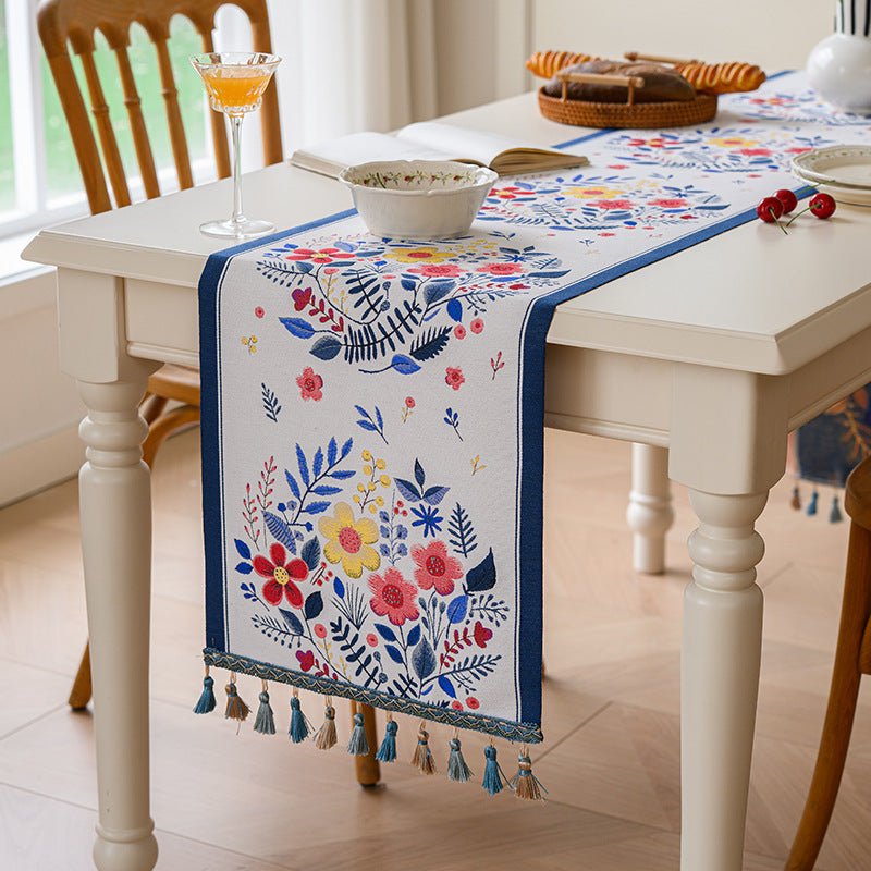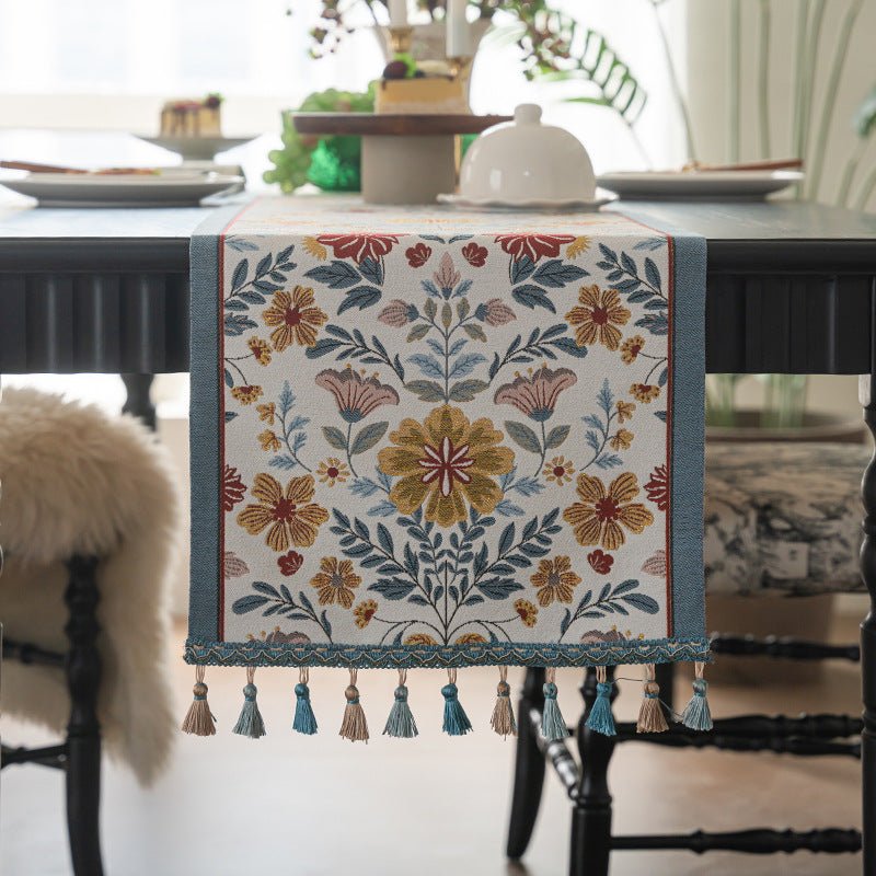 This table runner adds refined texture to dining and living spaces. Crafted from a soft poly-cotton blend with gradient tassels, it comes in multiple lengths to fit various tables and sideboards. Easy to care for and durable, it coordinates with sunflowers, florals, and geometric accents for a timeless American vintage look.