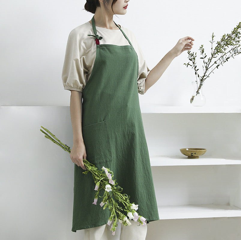 Japanese style sleeveless apron made from 100% cotton with a stain resistant finish. Suitable for women, men, teens, couples, adults, and seniors. Simple solid color design for a clean, minimalist look.Features: