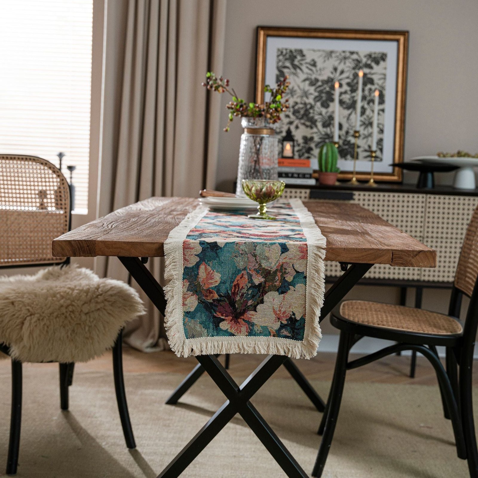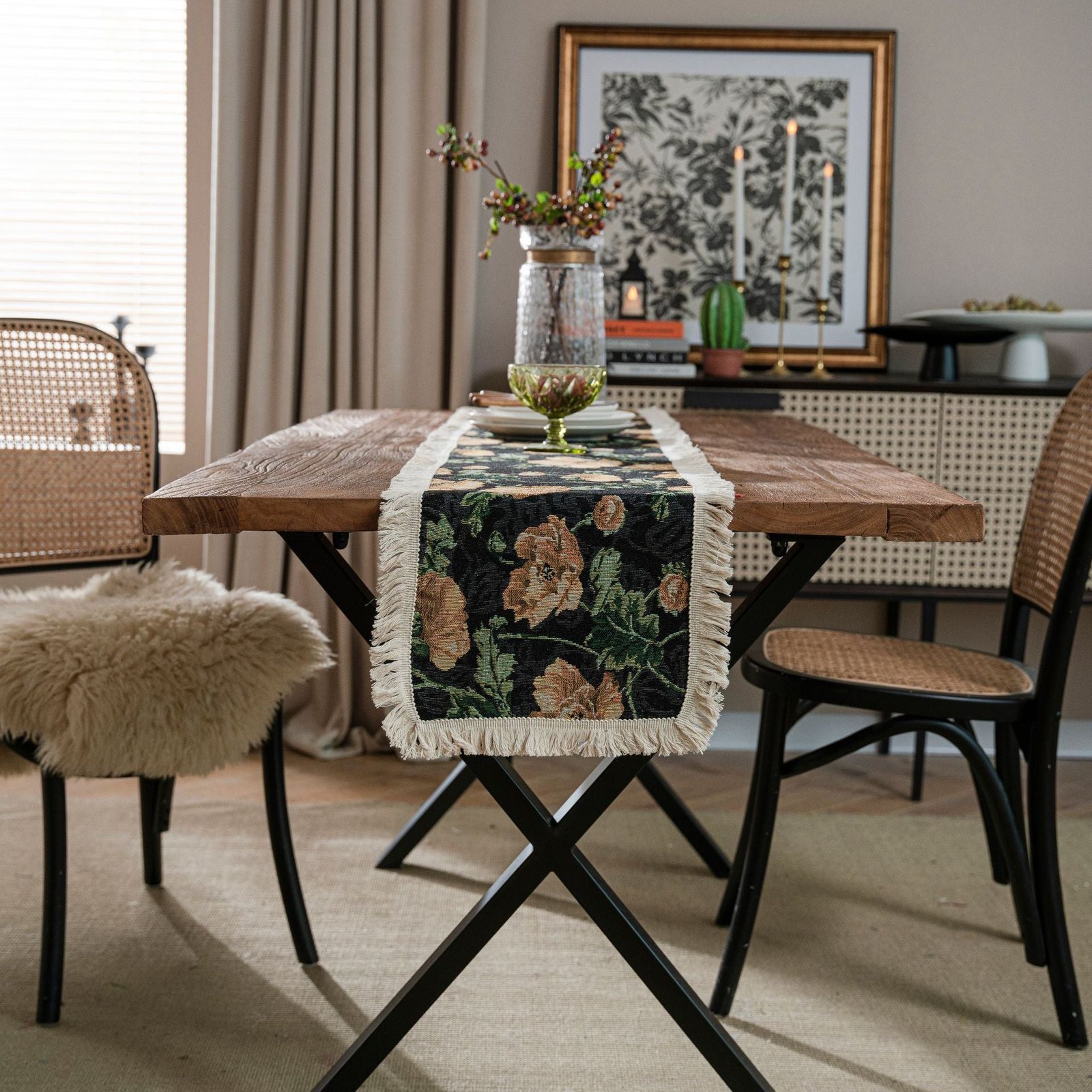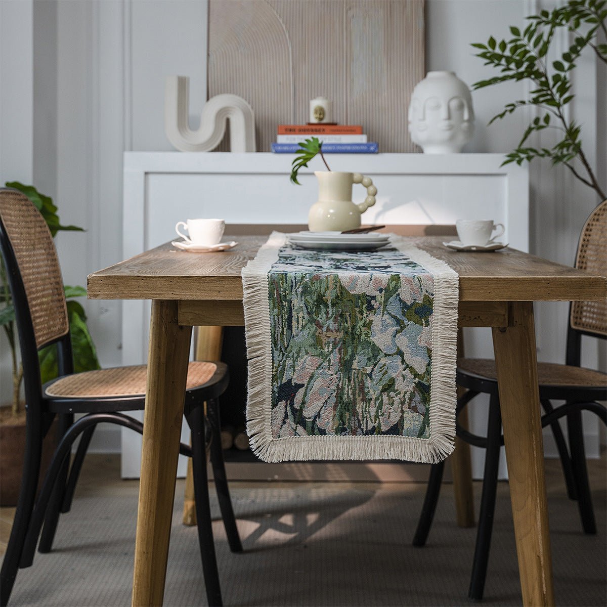All season table decor inspired by American styling. Made from a durable cotton-linen blend with a cotton-dominant composition (60% cotton, 40% polyester) for easy care and lasting beauty. The floral/grass/leaf pattern is woven in jacquard and finished with fringe tassels on all sides. This runner is offered in multiple sizes to fit dining tables, consoles, and commercial spaces, with optional customizations available.