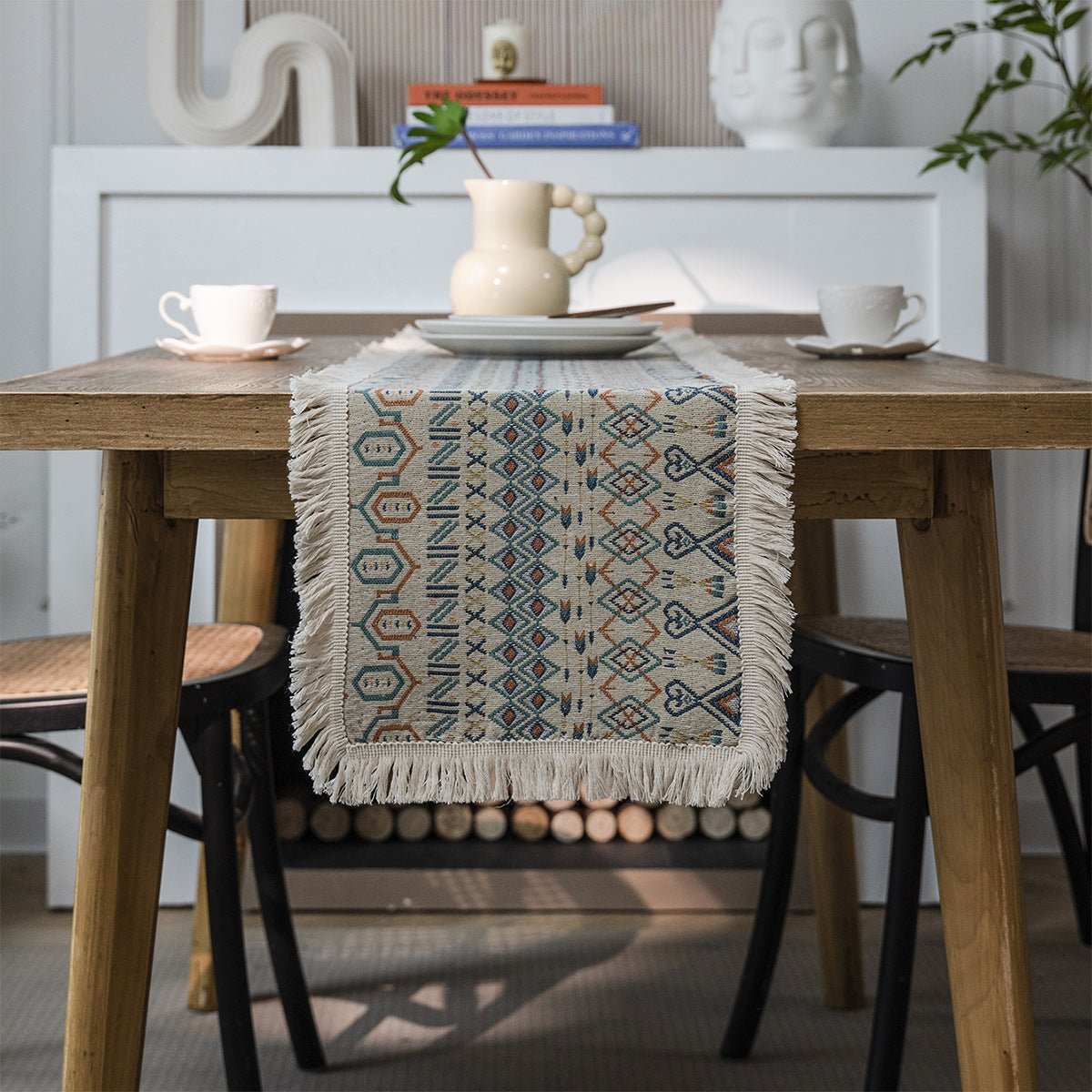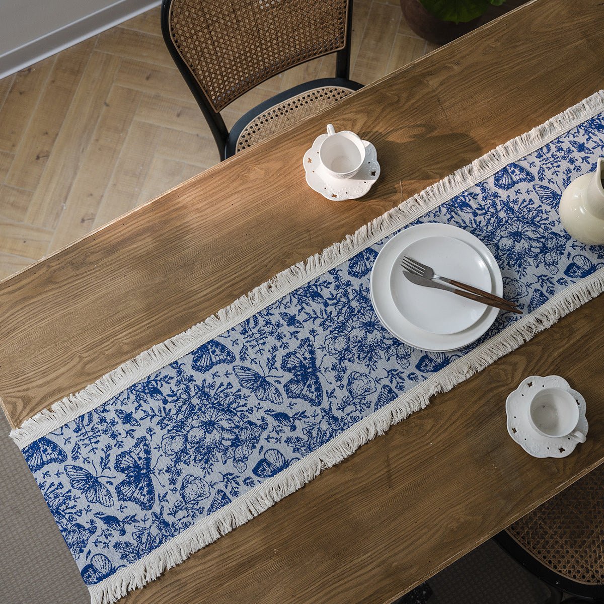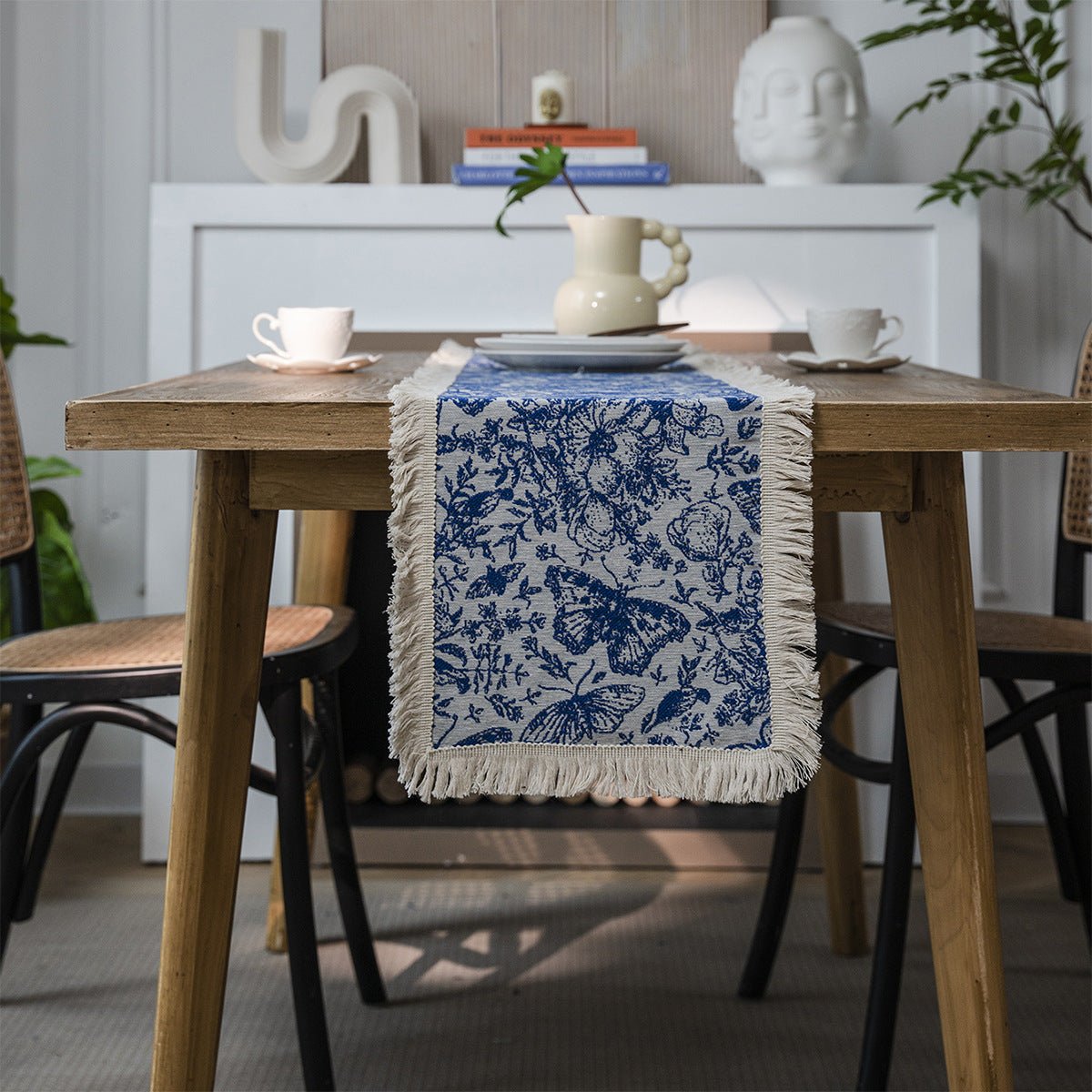 Enhance your table with an Americana-inspired table runner featuring a Butterfly Blue jacquard weave, a cotton-linen blend, and elegant fringe. Durable, stylish, and adaptable to home, retail, and hospitality environments. Customization options available to suit branding or gifting needs.