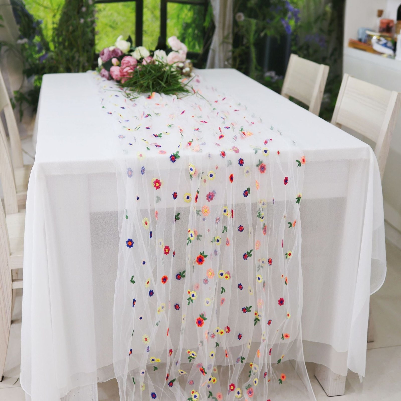 Summary: This embroidered daisy table runner blends graceful floral details with sheer lace for timeless charm. Made from 100% polyester, it drapes beautifully across three lengths, offering a delicate accent for weddings, garden parties, and everyday dining with easy care.