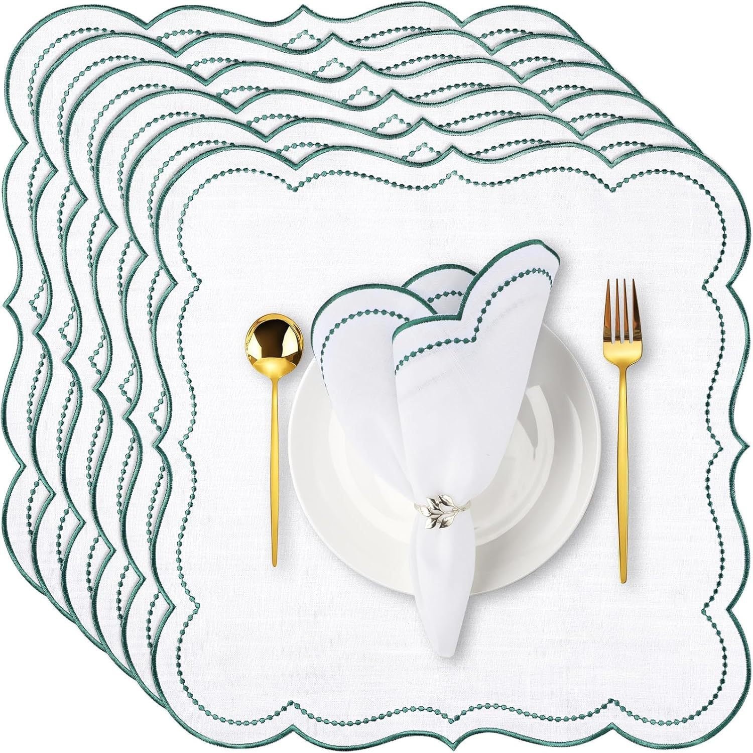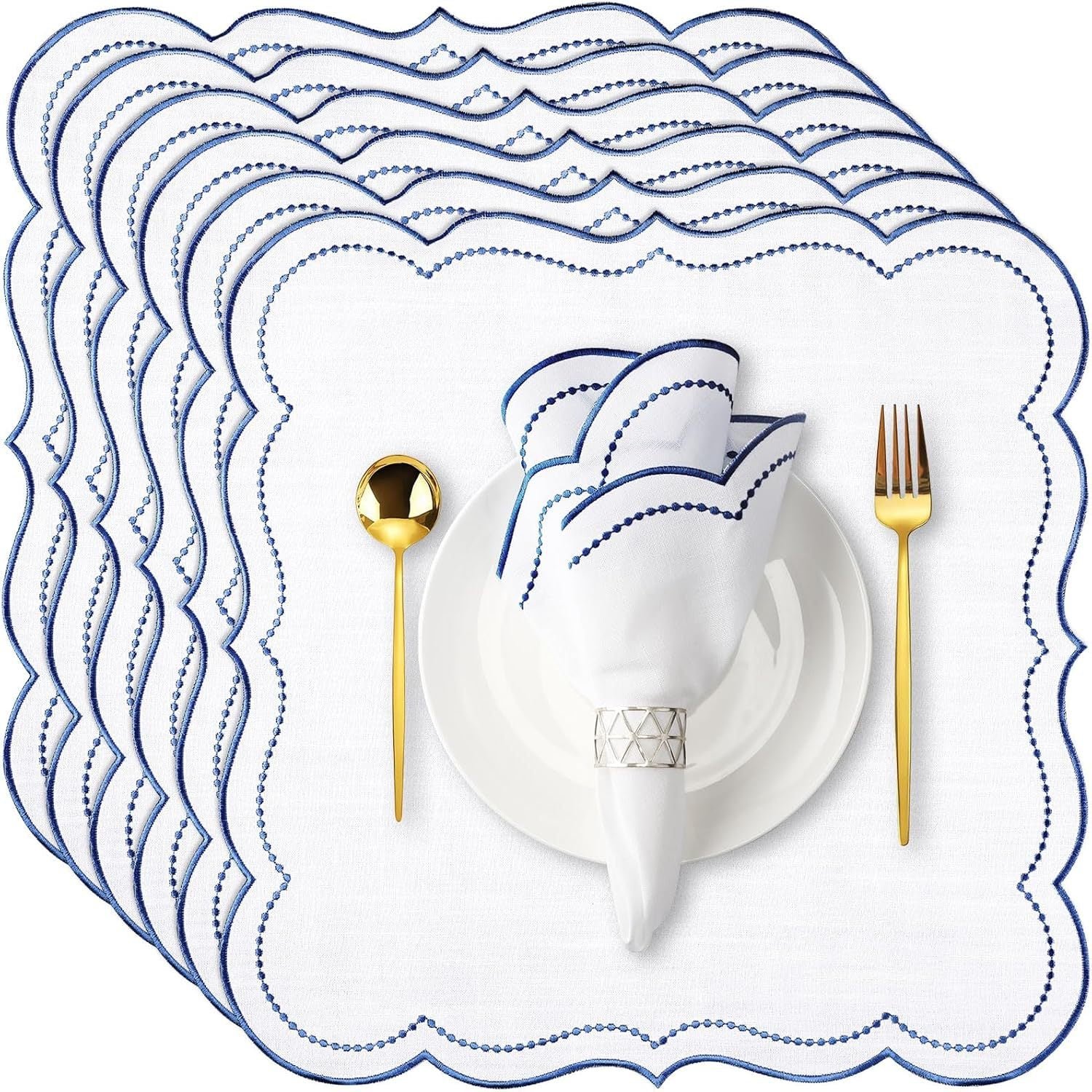 Embroidered wave edge design adds refined detail to any table setting.