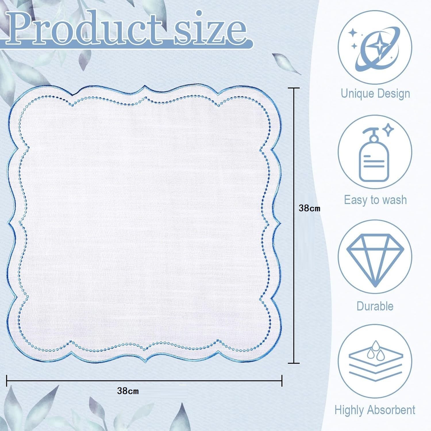 Size: 38 x 38 cm (15 x 15 in). Square shape suitable for napkins or placemats.
