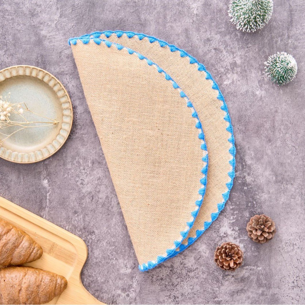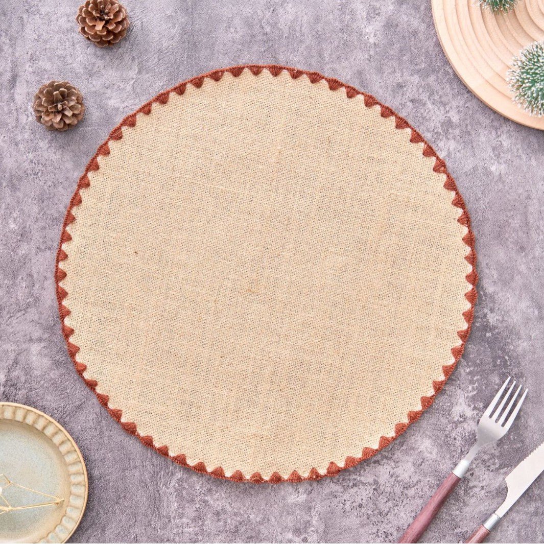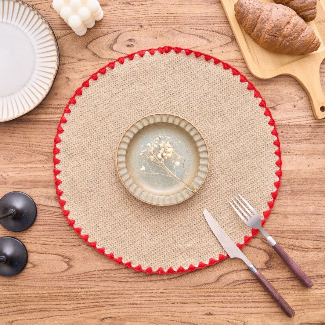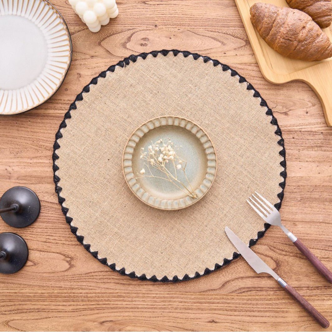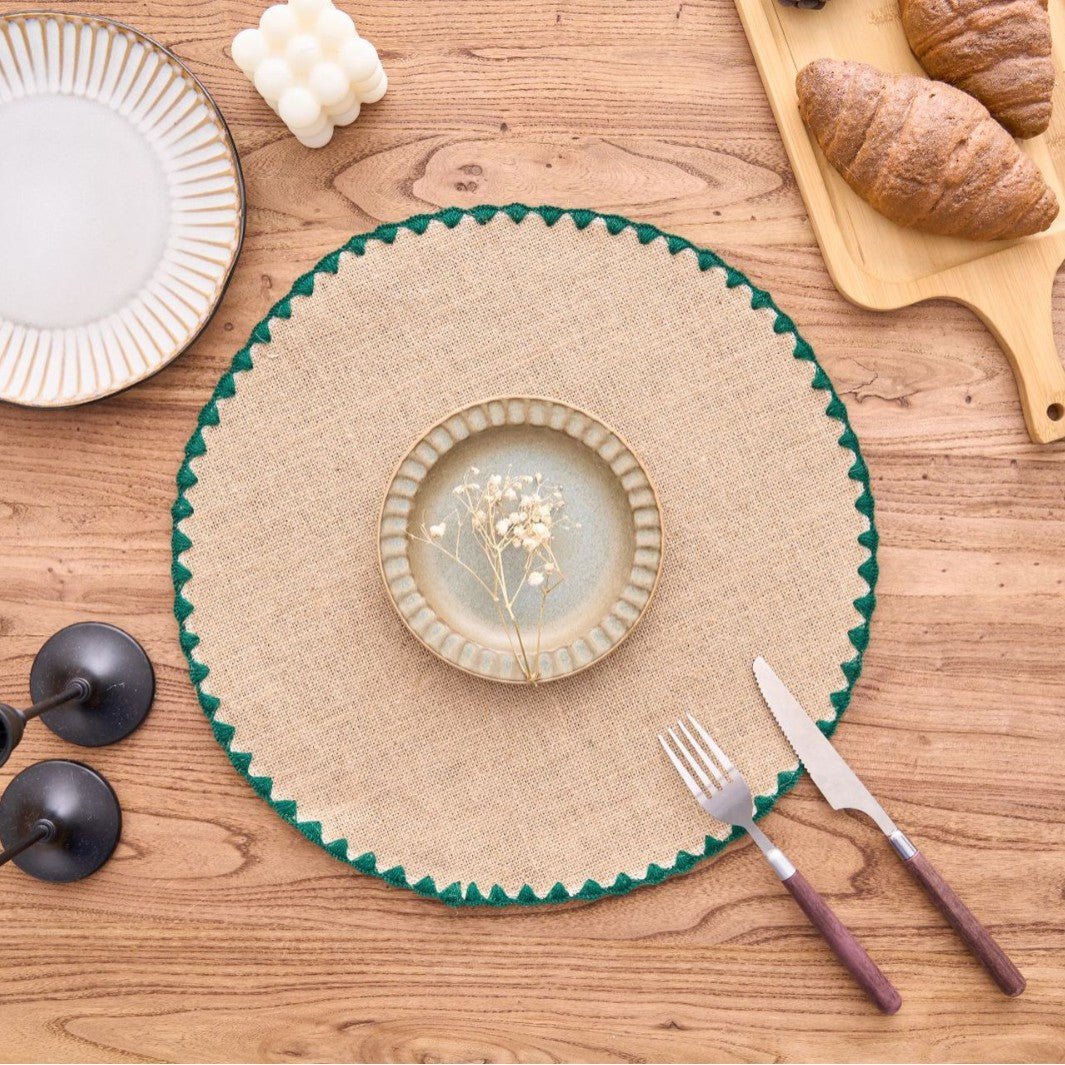 These French country round placemats bring rustic charm to dining tables, cafes, and photography sets. Made from a cotton-polyester blend, they feature a braided lace edge and six hemp-embroidered shell colorways. Durable, easy to clean, and perfect for everyday use.
