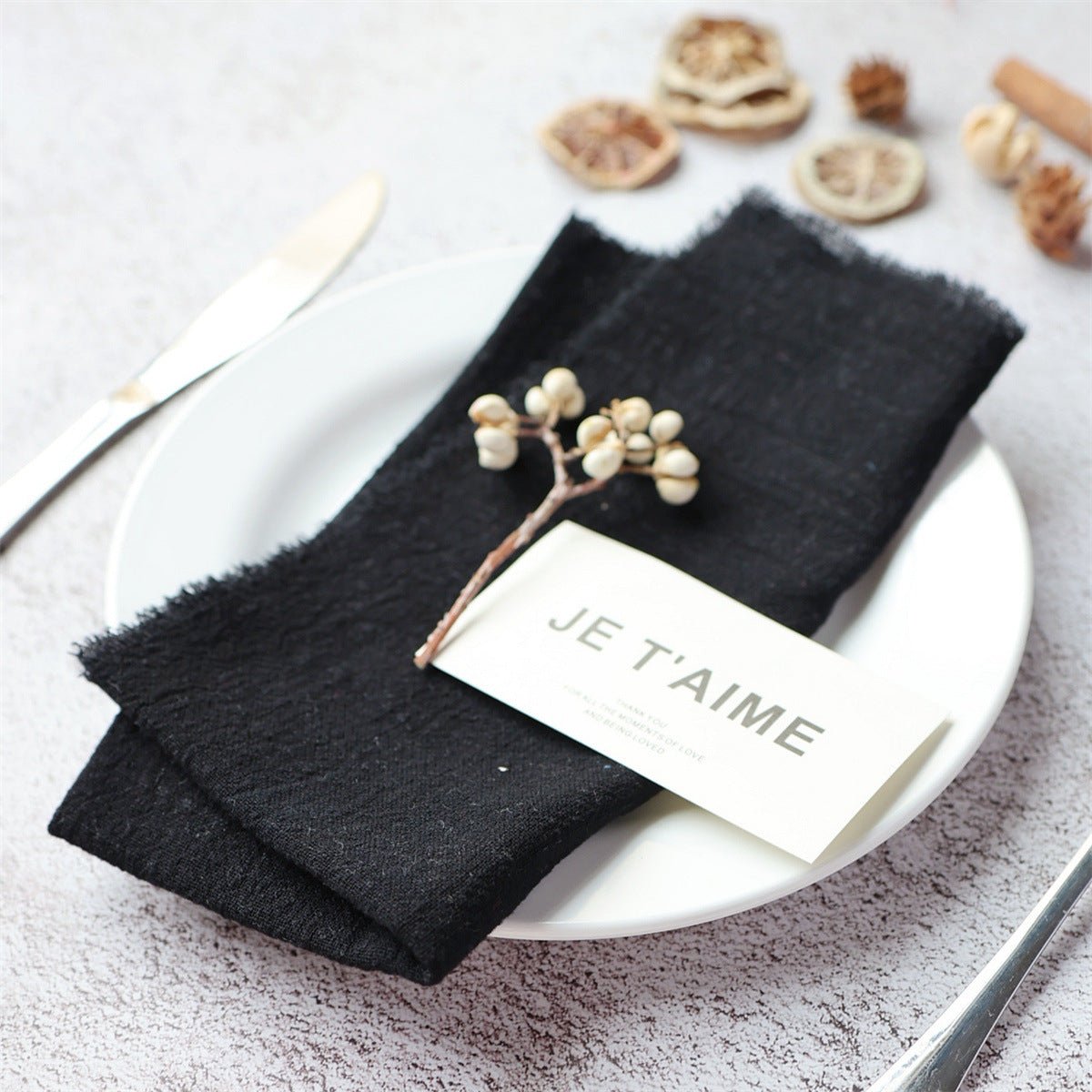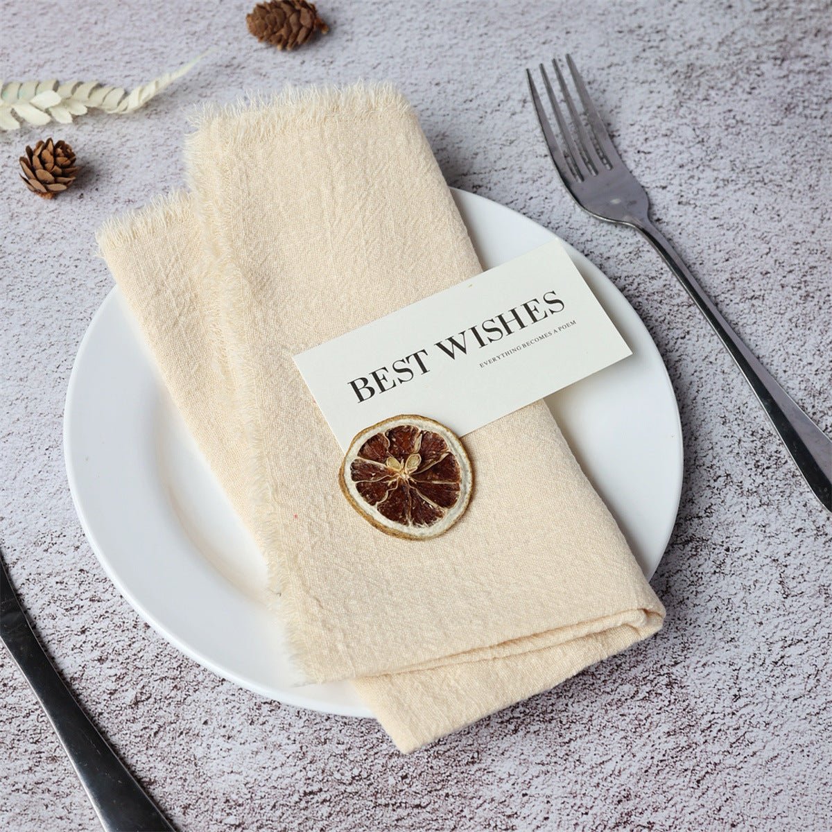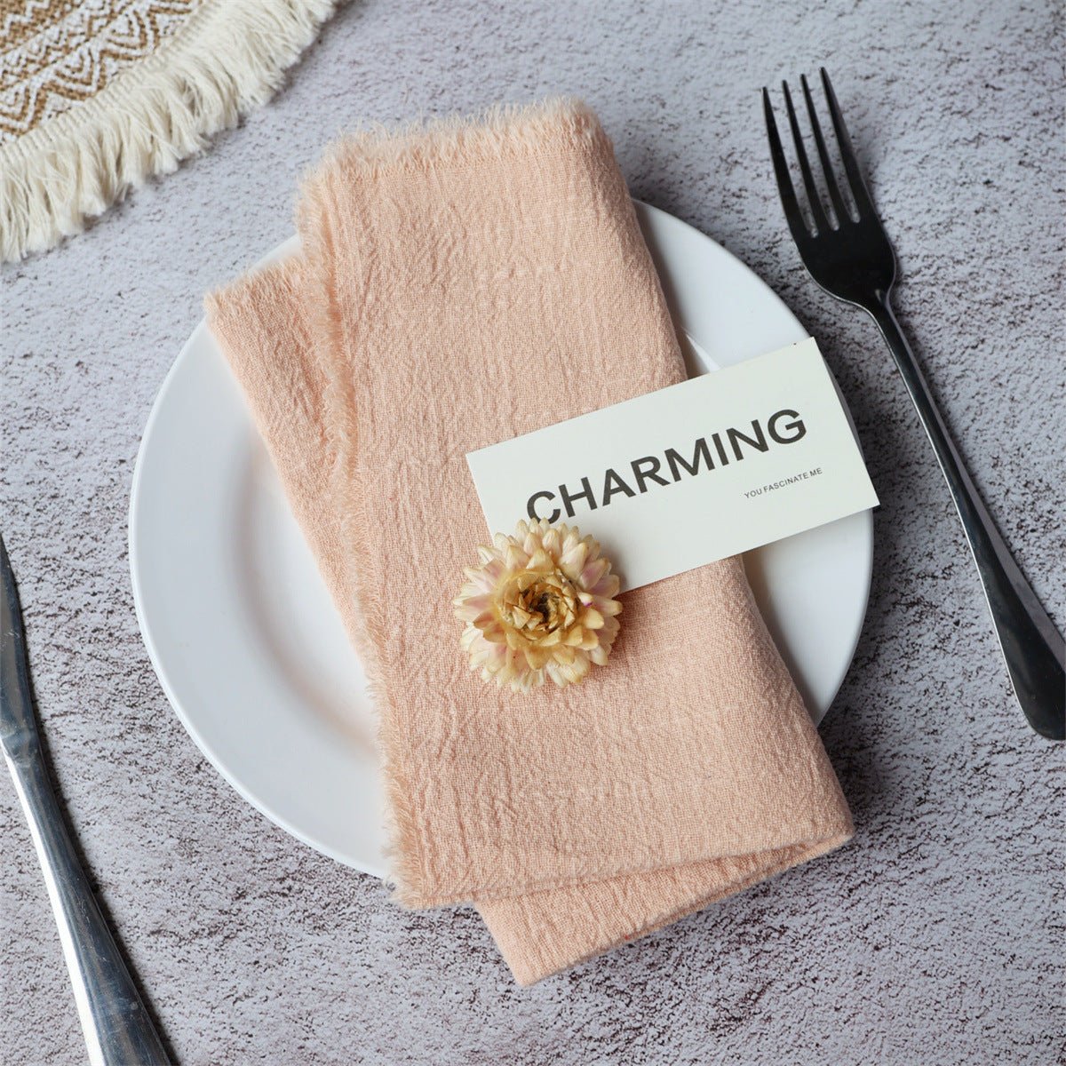 Summary: These fringed cotton napkins bring timeless texture and boutique charm to Nordic-inspired tables. Crafted from 100% cotton, they drape softly, resist wear, and wash easily, making them suitable for everyday use or elegant events. Customizable for weddings, home entertaining, and hospitality settings.
