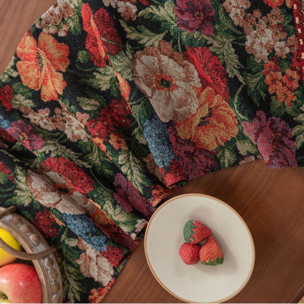 Overview: All Season (Spring Fall Winter) Jacquard Table Flag with Tassels, featuring the Prosperity Bloom motif for vintage tea table decor.