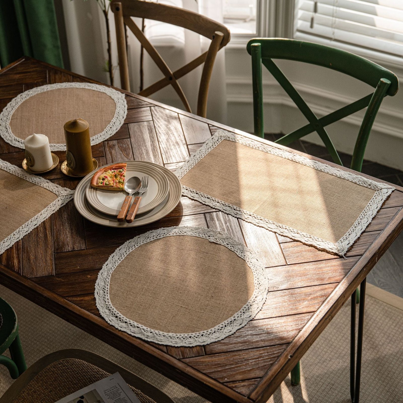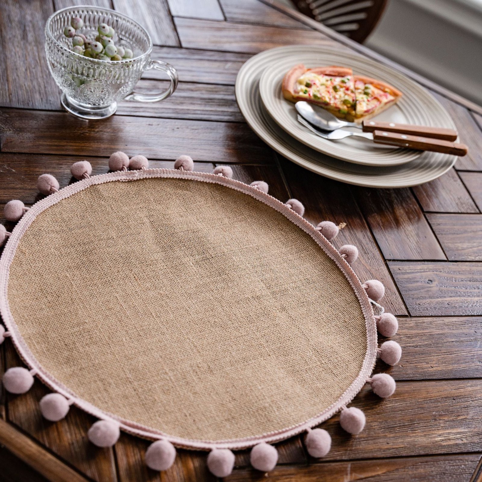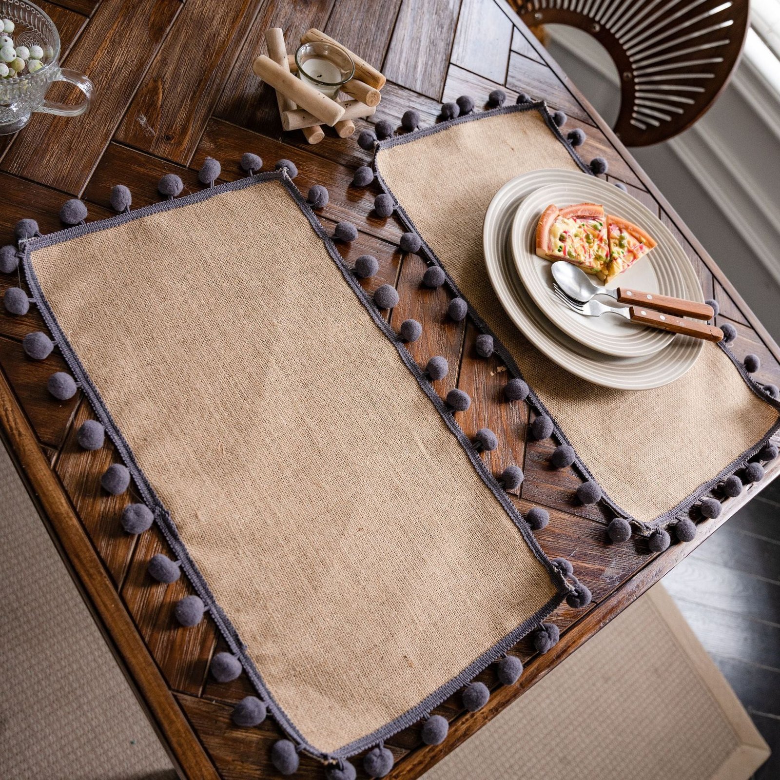 Features: Handmade jute rope placemat with decorative tassels, pom-poms, lace, or gold-thread accents. Made from a cotton-linen fabric blend with natural jute details for a rustic yet refined look.