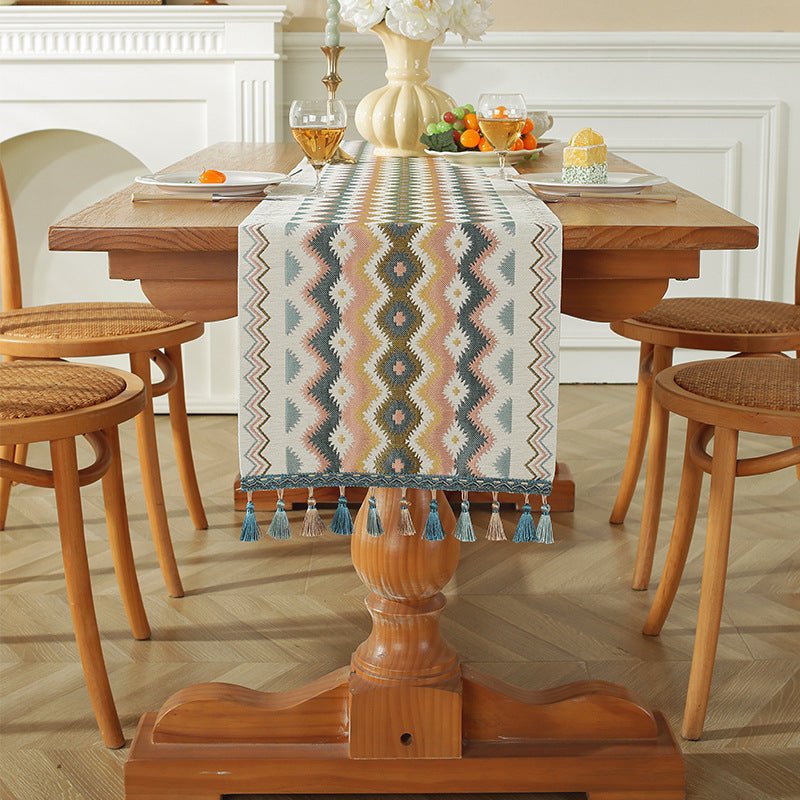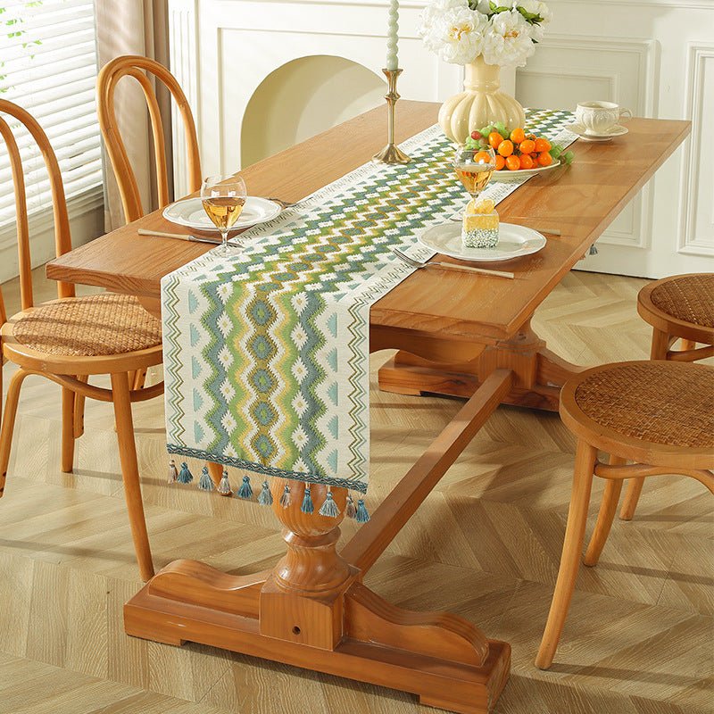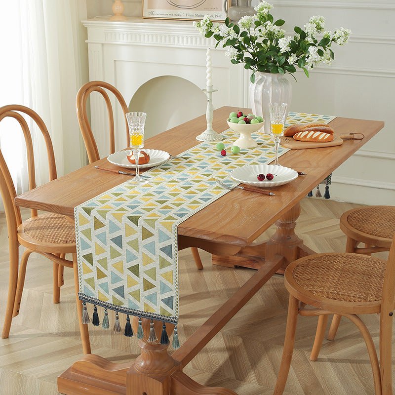 Premium polyester table runner designed for modern living spaces, featuring gradient tassels that add movement and color to your table setting.