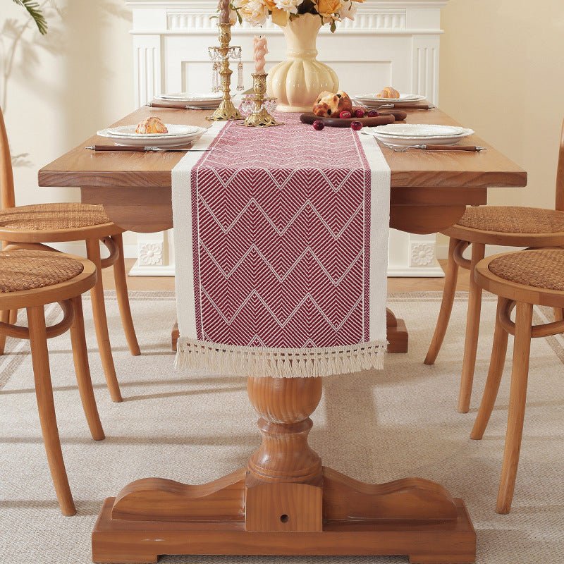 – Pattern: Striped wave design in beige tones with woven tassels.