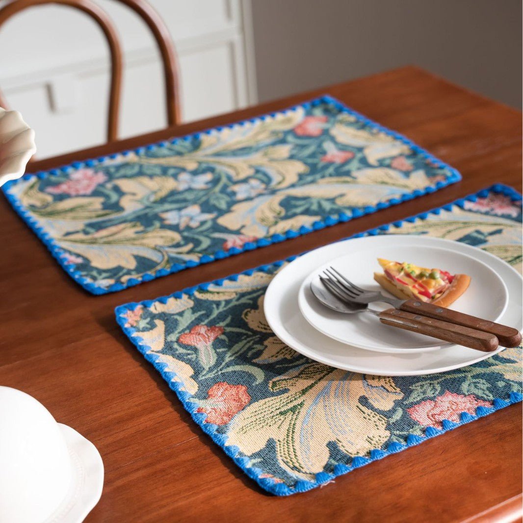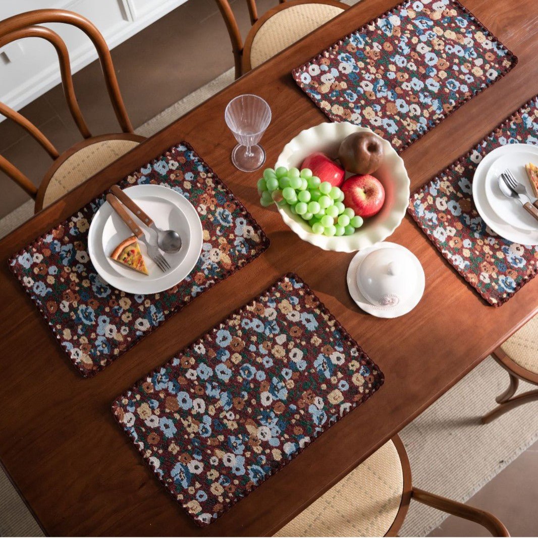Product overview: Elegant jacquard placemats featuring embroidered floral motifs on a cotton polyester blend. Designed to add color and texture to dining tables and living spaces while protecting surfaces.