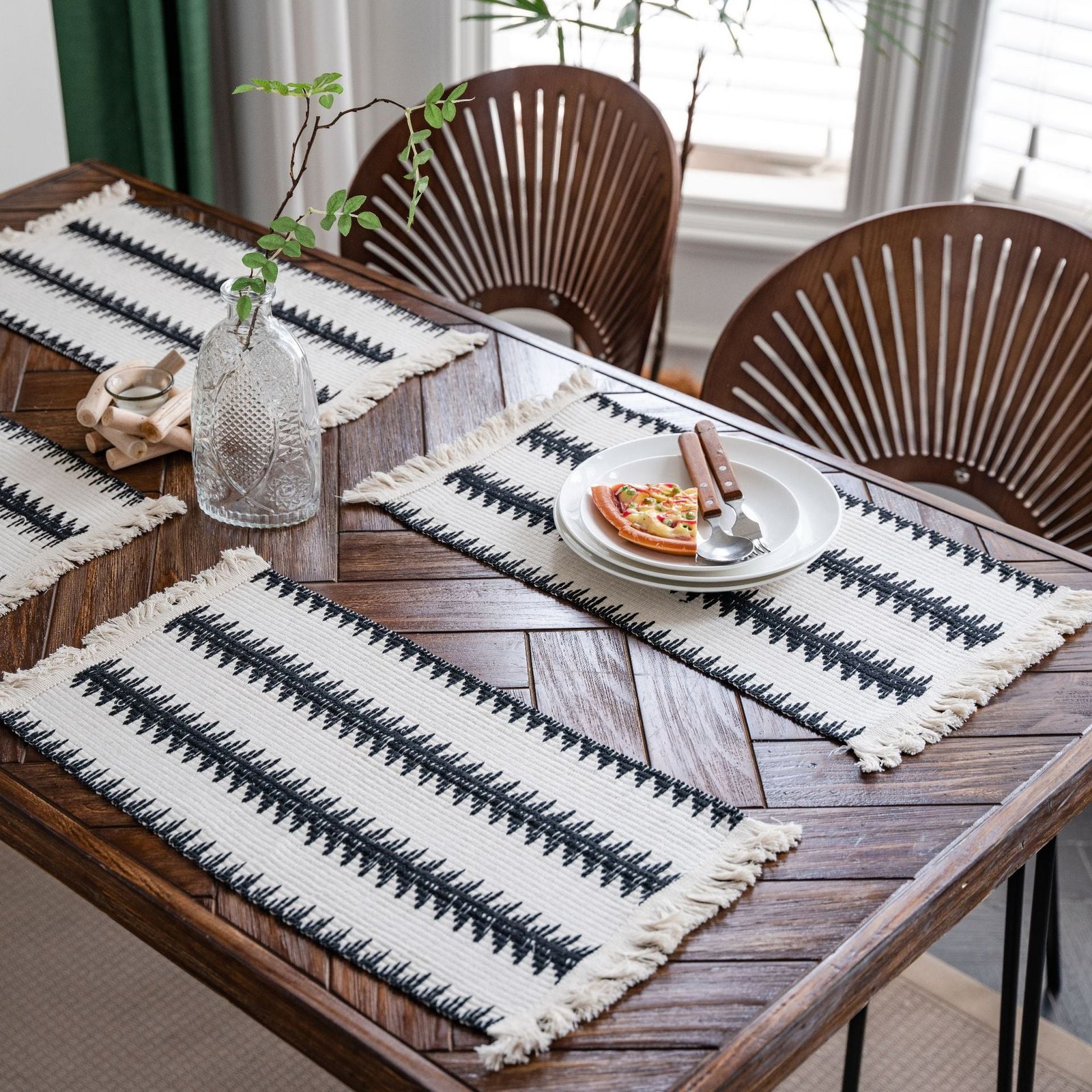 Product Overview: Knit striped fringe placemats made from a breathable cotton-linen blend. Square 30 x 50 cm size fits standard place settings and brings a modern minimalist texture to any table.