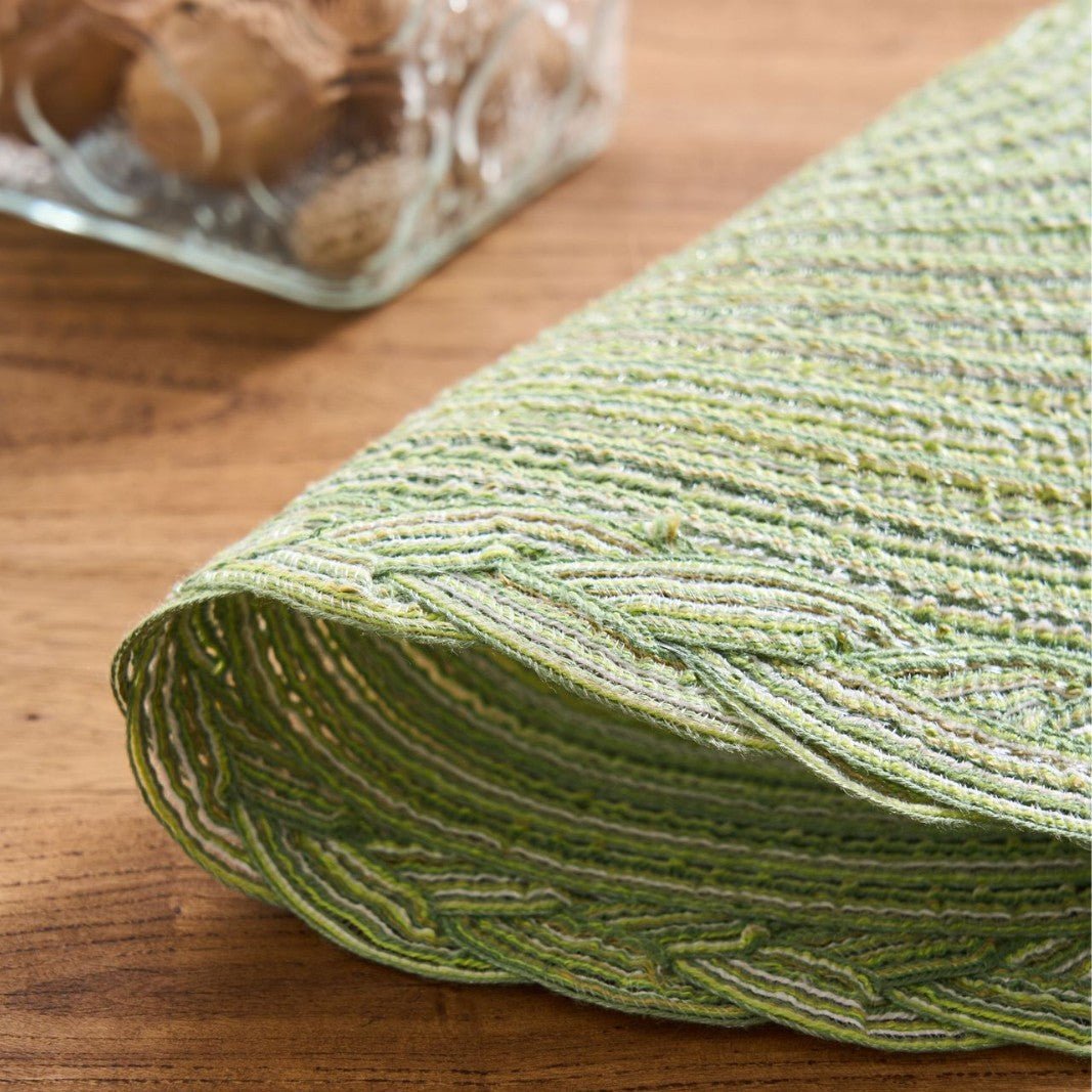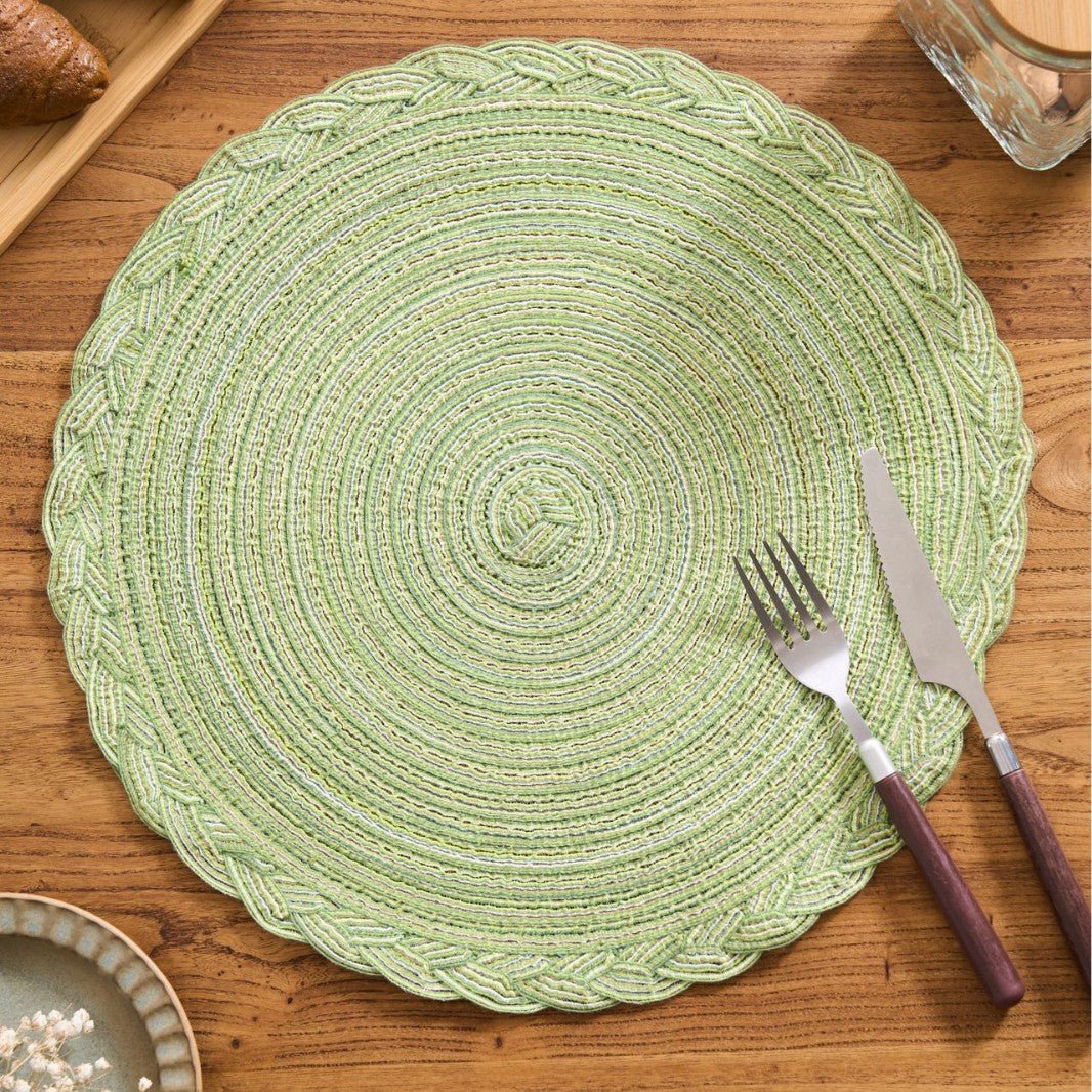Versatile round placemat with a delicate braided lace edge, crafted from a durable polyester-cotton blend. Available in five colors and three diameters, it elevates rustic dining and outdoor tables while protecting surfaces and serving as a stylish prop for photography.