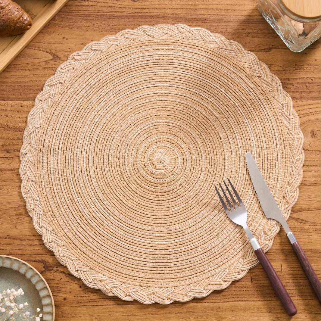 Shape & Design Round placemat with a delicate braided lace edge for a touch of rustic elegance.