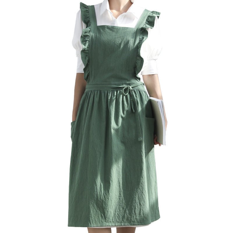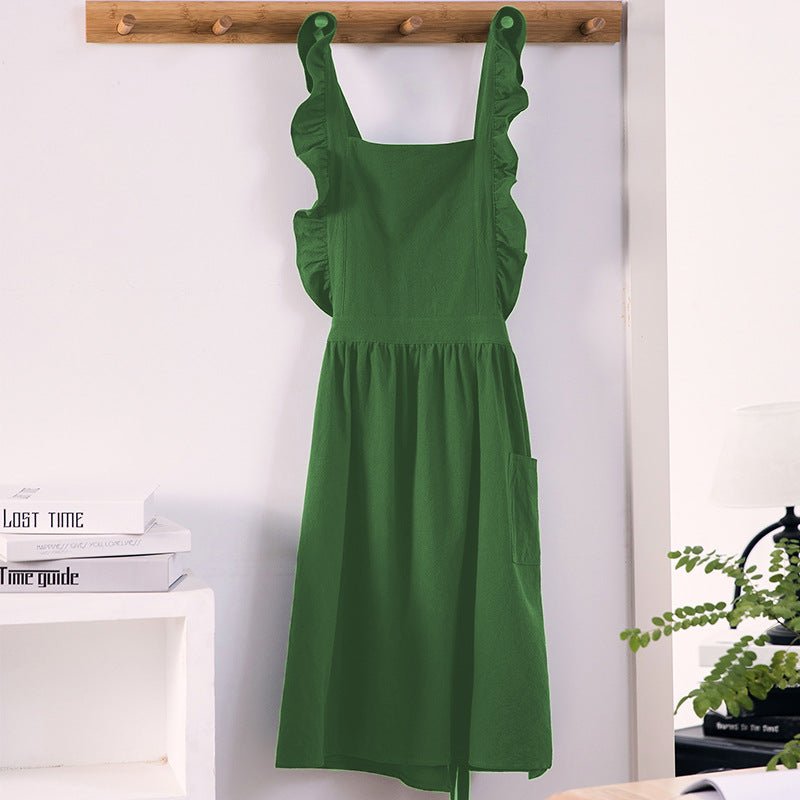 This all-cotton, stain-resistant apron protects clothing during cooking, offering a comfortable one-size fit and a stylish touch with a ruffle trim. Available in five colors, it suits women, men, couples, and families who want a modern, easy-care kitchen essential.