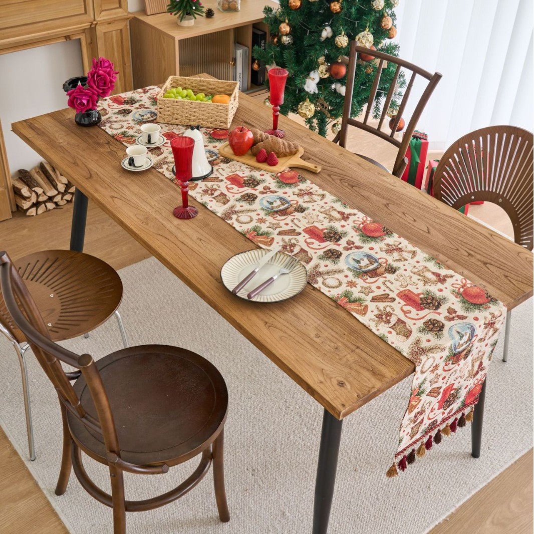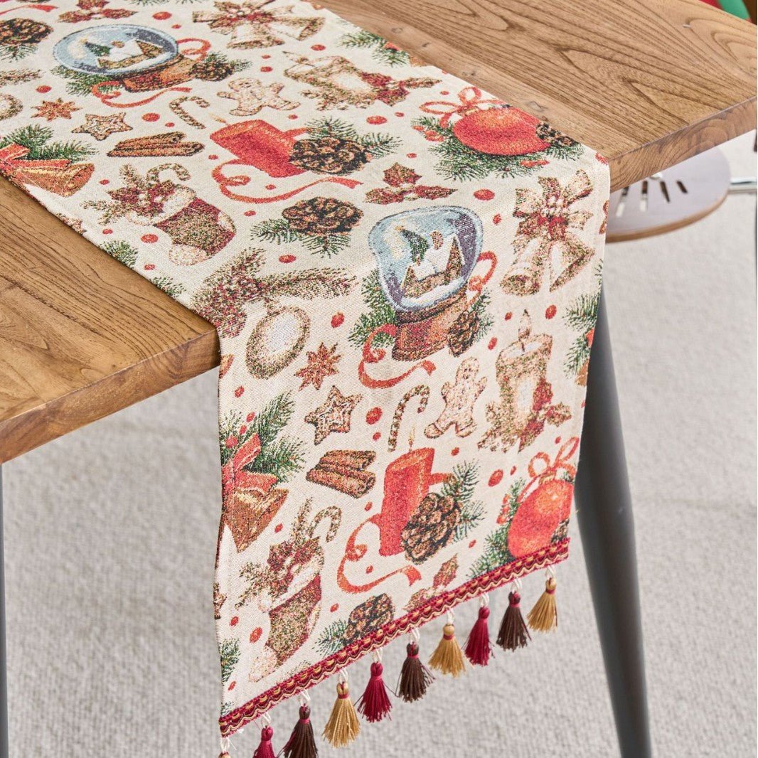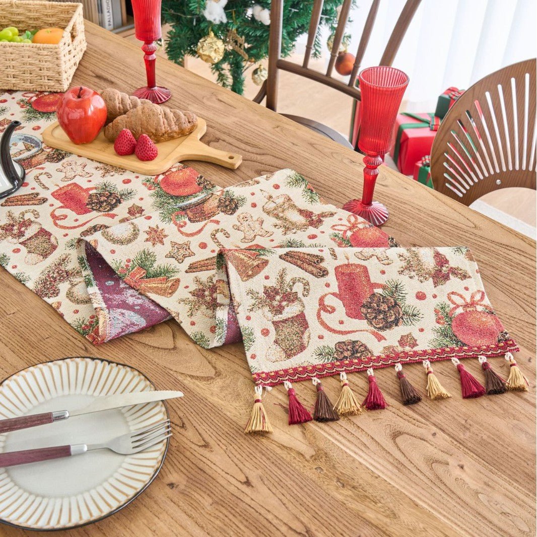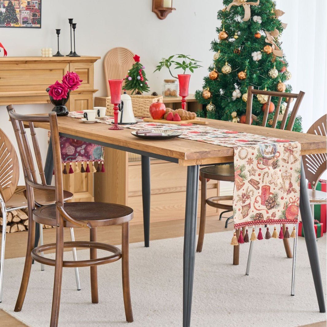 Combining vintage charm with modern durability, this table flag adds timeless elegance to dining rooms, cafés, and shop displays. The stripe jacquard with gold-thread tassels delivers festive detail, while the polyester-cotton blend ensures colorfast, easy care, and lasting performance. Available in multiple lengths and three decorative patterns to suit any space.
