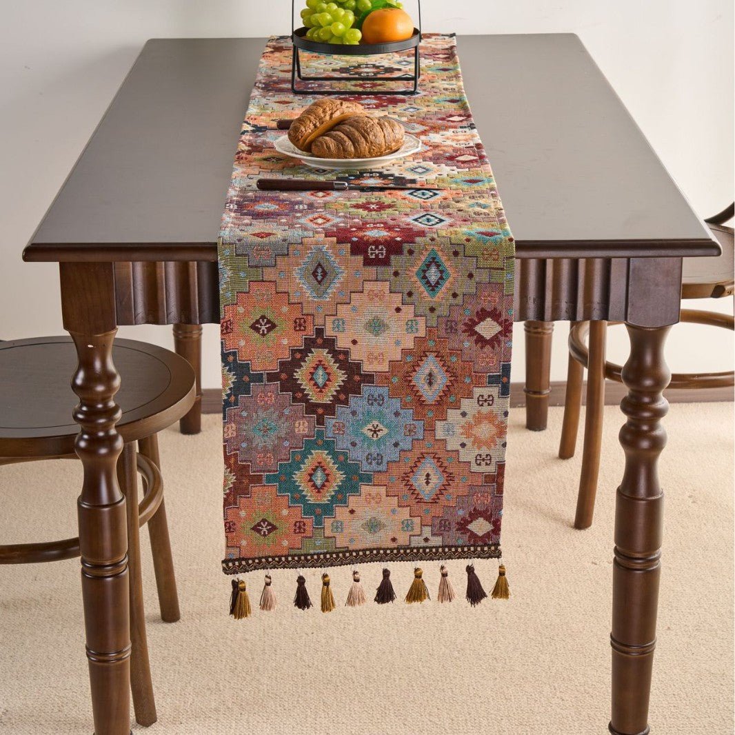 Summary: Elevate tabletops with a durable, stylish table runner featuring jacquard floral weave and tassel fringe. Ideal for restaurants, hotels, or home dining, available in multiple colors and sizes, and customizable to fit your brand.