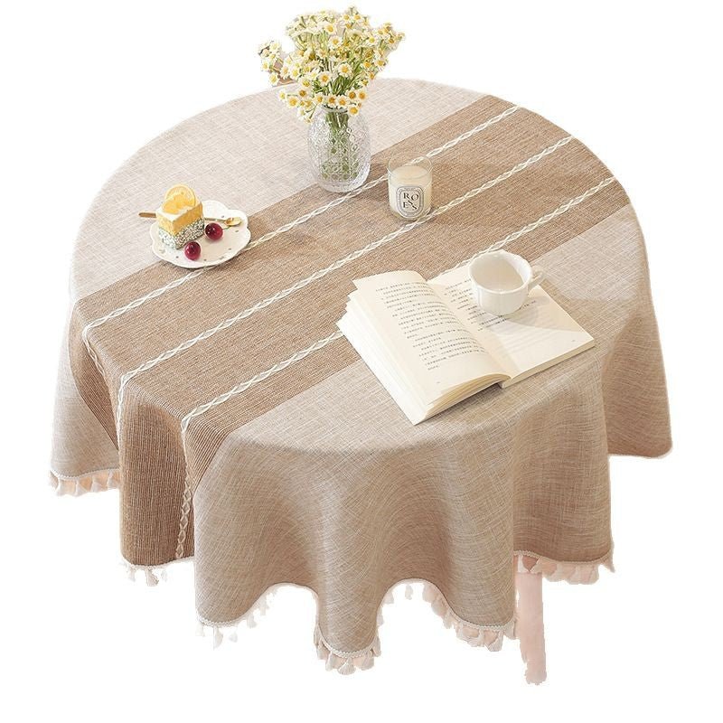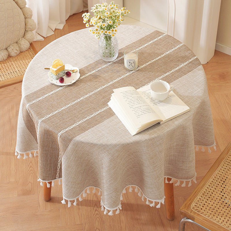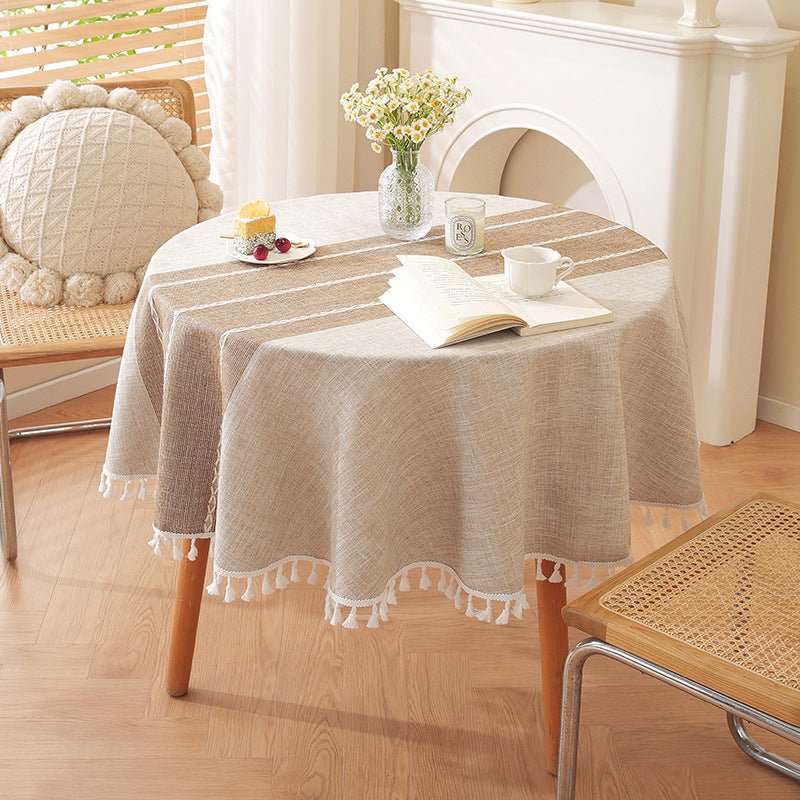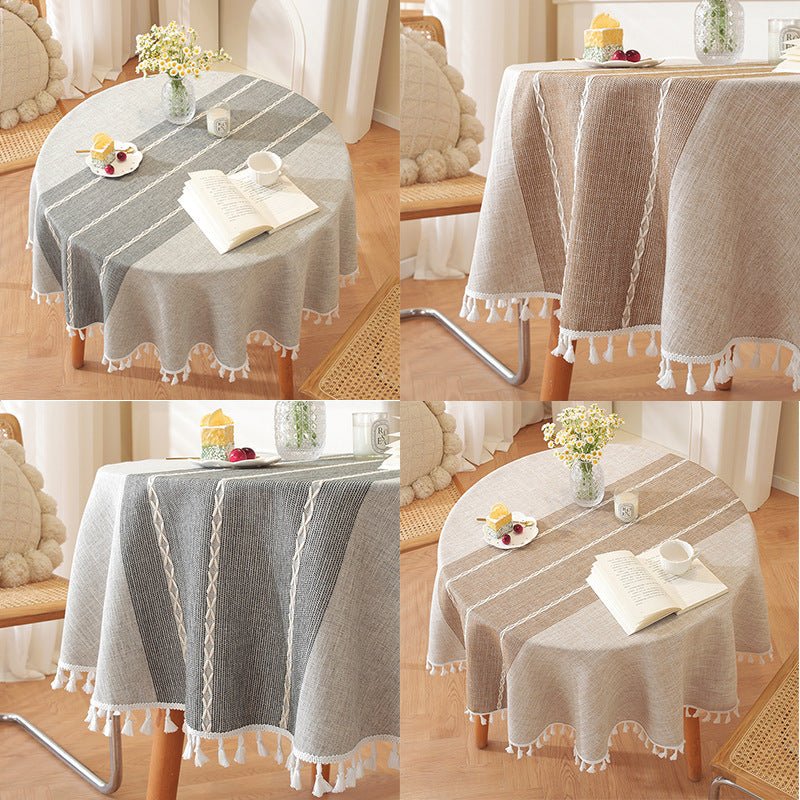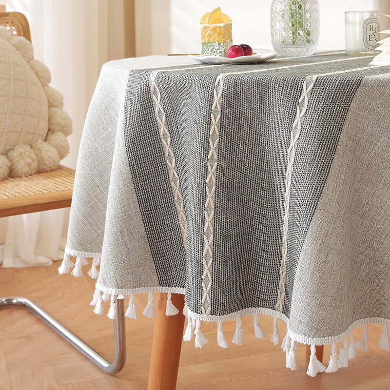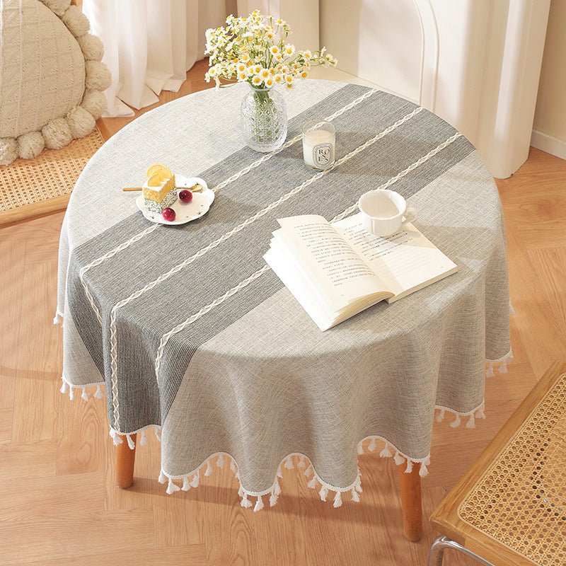 This Nordic stripe tablecloth set offers a versatile polyester-cotton blend with tassel trim, available in multiple square and round sizes to suit dining or desk spaces, providing timeless style and easy maintenance for contemporary homes.