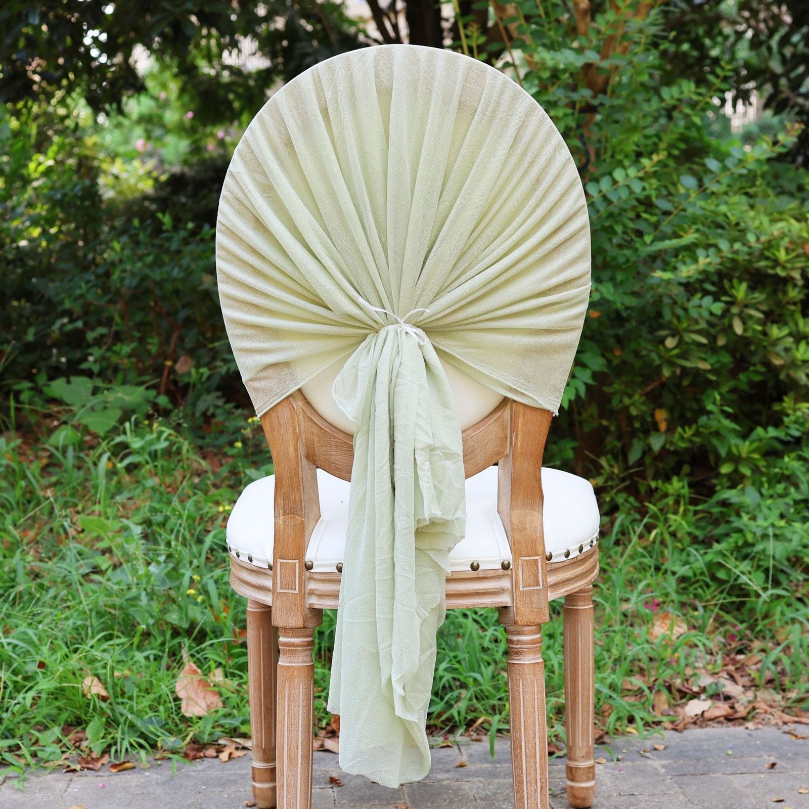 This product is a decorative chair cover crafted from polyester tulle, designed to elevate wedding and event aesthetics with a refined, elegant look.